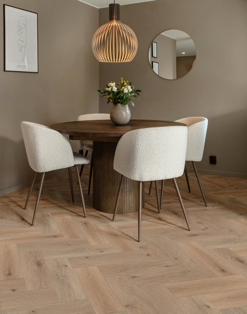Designed to replicate the raw elegance of weathered oak, this flooring delivers textured grain detailing and subtle colour variation, creating a sense of depth and warmth underfoot. Whether you're styling a modern apartment or a cozy boutique space, the herringbone pattern adds timeless visual appeal and architectural interest.